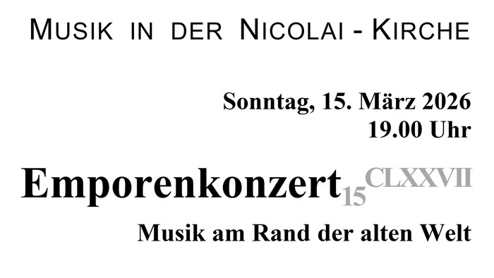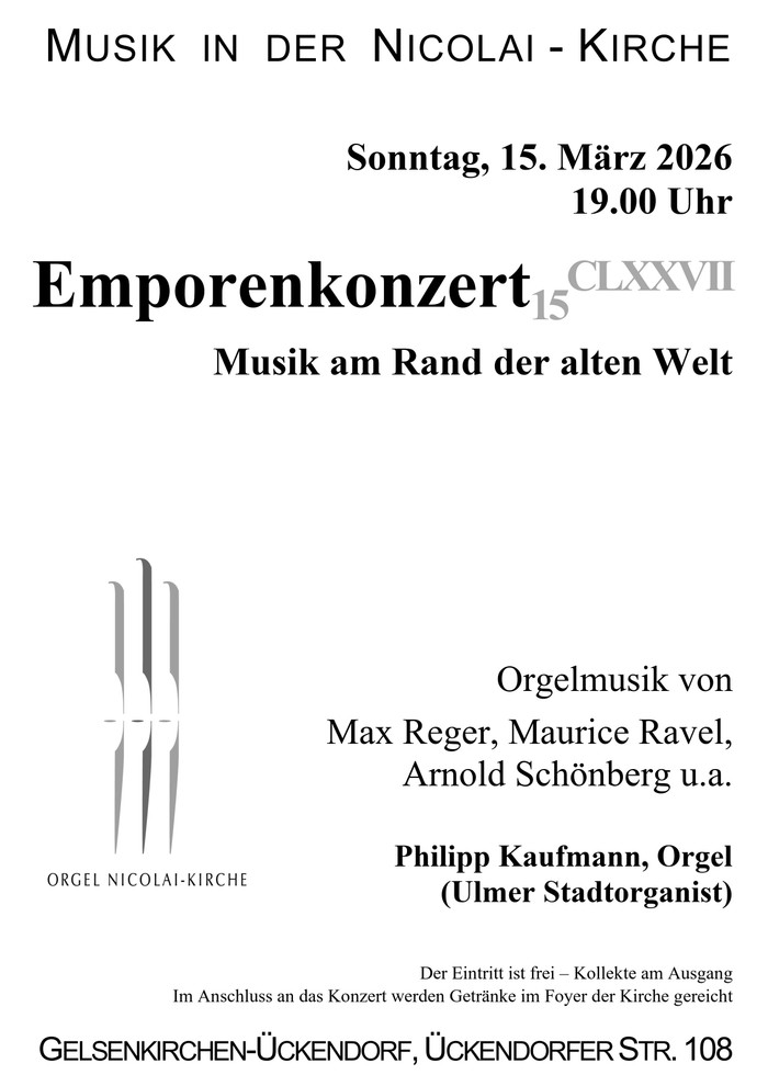 Am Sonntag, 15. März 2026 findet um 19.00 Uhr das 177. Konzert in der Reihe „Emporenkonzerte“ in der Nicolai-Kirche Gelsenkirchen-Ückendorf, Ückendorfer Str. 108 statt.