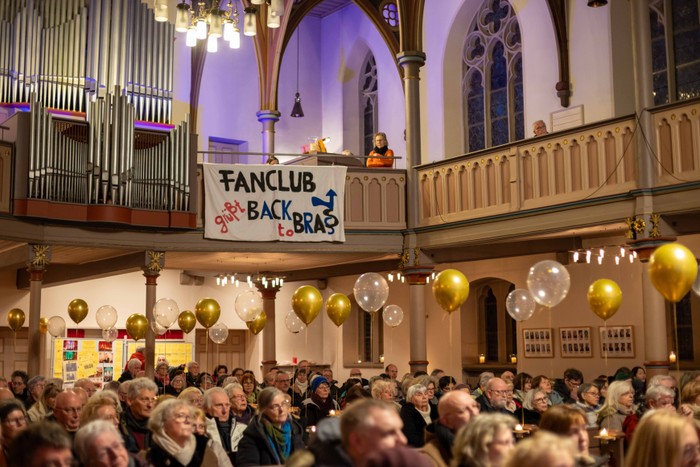 „Falsches Datum, falsche Uhrzeit, falscher Ort“, mit diesen Worten umschrieb Andreas Fröhling, der die Konzertreihe 2003 ins Leben rief, die besonderen Umstände dieses Emporenkonzerts in der Ückendorfer Kirche. Denn normalerweise versammeln sich Musizierende und Zuhörerinnen und Zuhörer immer wieder am 15. eines Monats auf der Orgelempore. „Und immer um 19.00 Uhr, das steht fest in meinem Kalender“, bekräftigt eine Besucherin. Nun, diesmal begann das Konzert schon zwei Stunden früher. Fleißige Mithelfende hatten die Nicolai-Kirche festlich mit Luftballons geschmückt. Im Altarraum erstrahlte eine güldene 175.